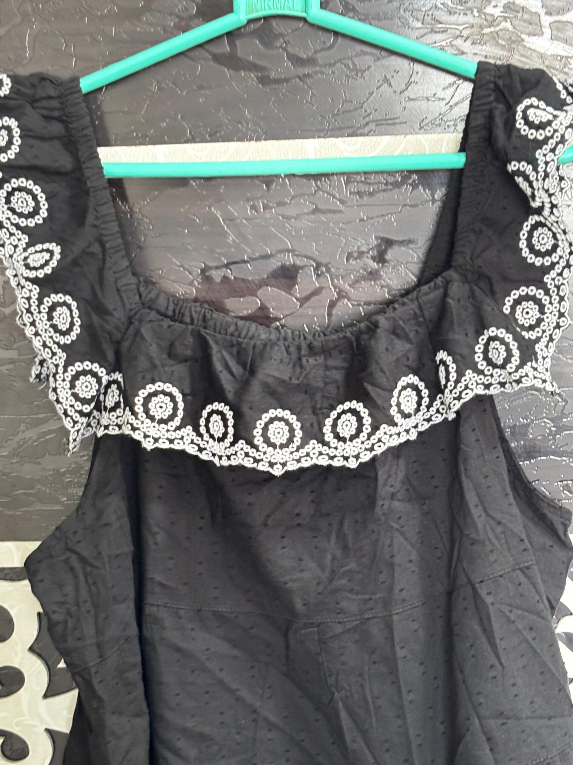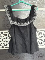 Black Off Shoulder Top with White Embroidery in front and back on textured color.