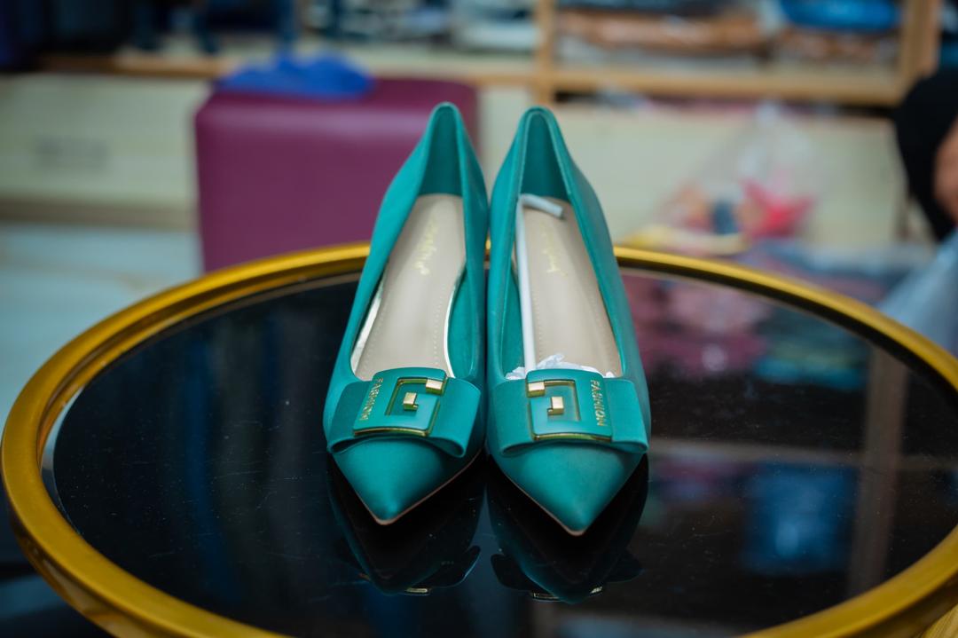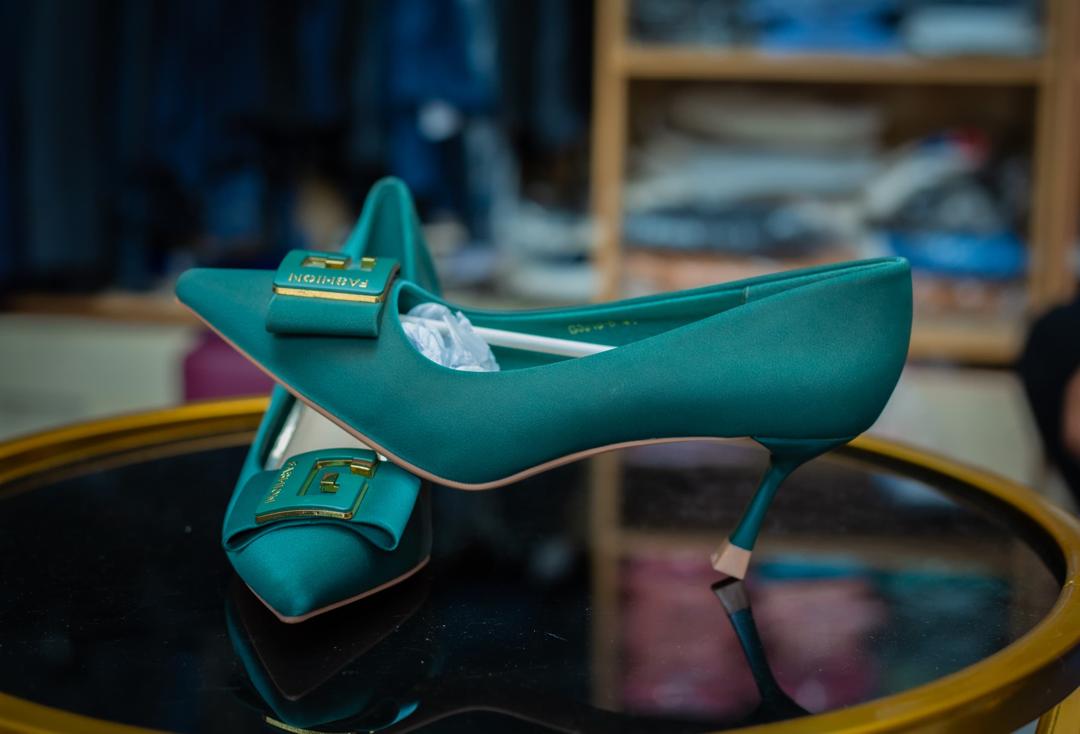 Matte Green high heels with a self-color broach upon it.