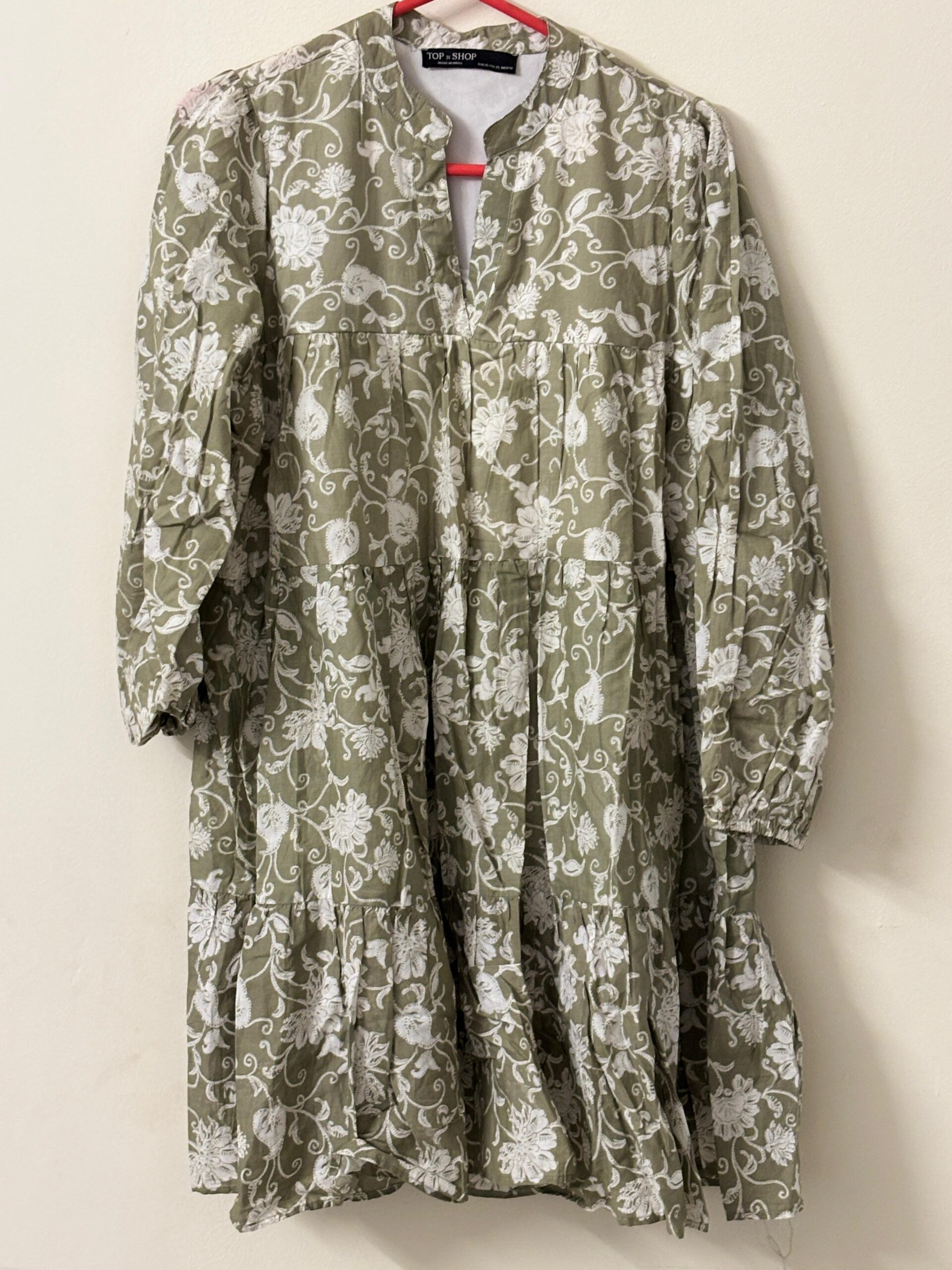 Top & Shop brand, made in India, Green Knee length dress in pure cotton material cuff sleeves.