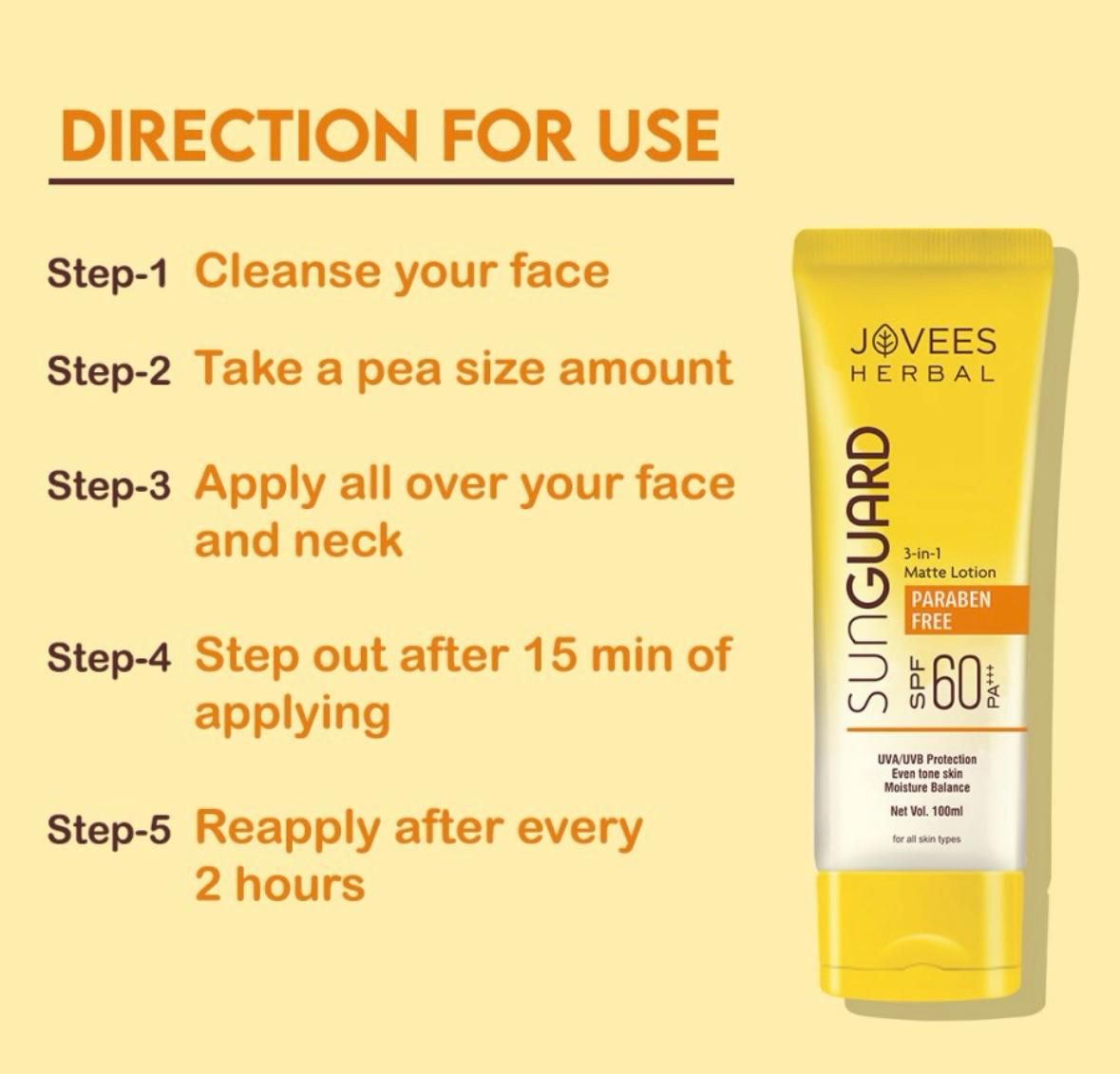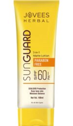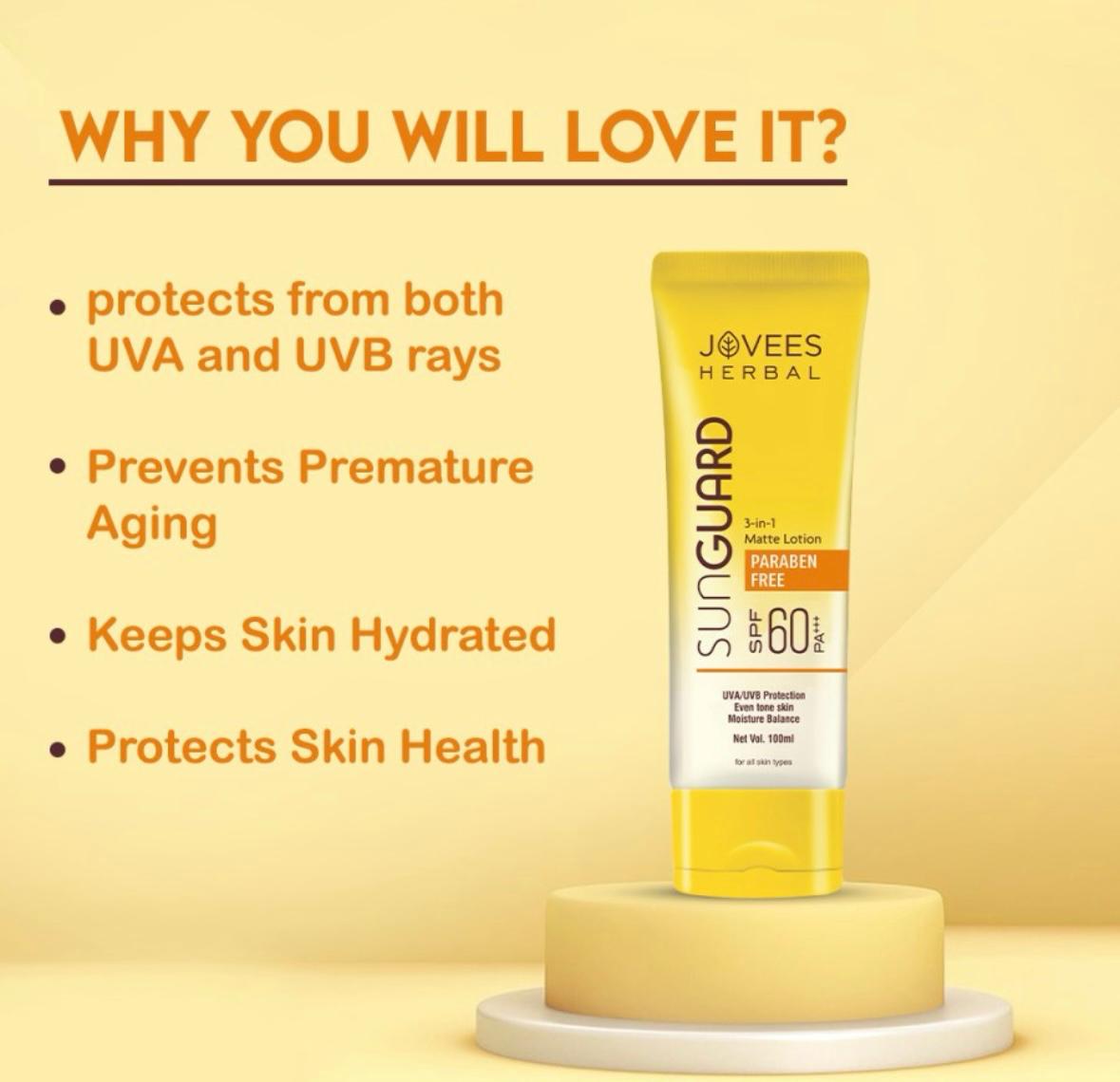 Jovees Sun Guard Lotion SPF 60 PA+++ is your ultimate companion for sun protection. This 3-in-1 matte lotion goes beyond being a normal sunscreen, offering complete protection against both UVA and UVB rays.