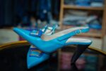 Purse brand sandal in blue shade with a golden broach on top with the brand name, high quality product.