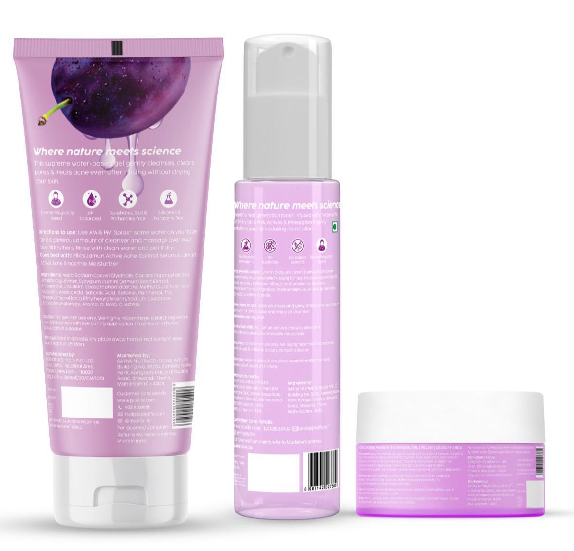 The Plix Jamun Clarifying Fruity combo of Toner, moisturizer & cleanser stands out as a meticulously crafted solution for those seeking to refine their skin texture and target pesky clogged pores. Infused with a potent blend of ingredients, including an AHA formula for gentle exfoliation, Niacinamide to diminish the appearance of large pores, and 2% Salicylic Acid derived from willow bark to effectively combat acne and promote skin renewal.
