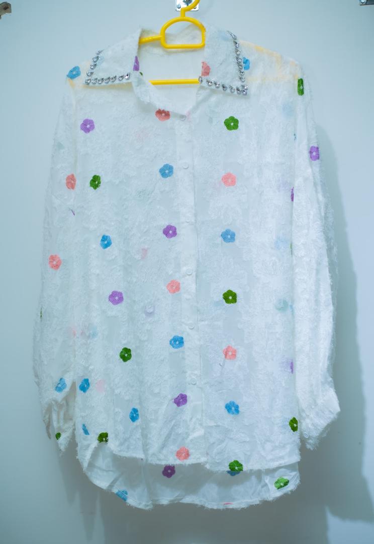Beautiful shirt in white color with multi color small florals all over the shirt, comes inn textured high quality and diamonds over the collar.