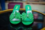 Green with a bow and diamonds all over it.