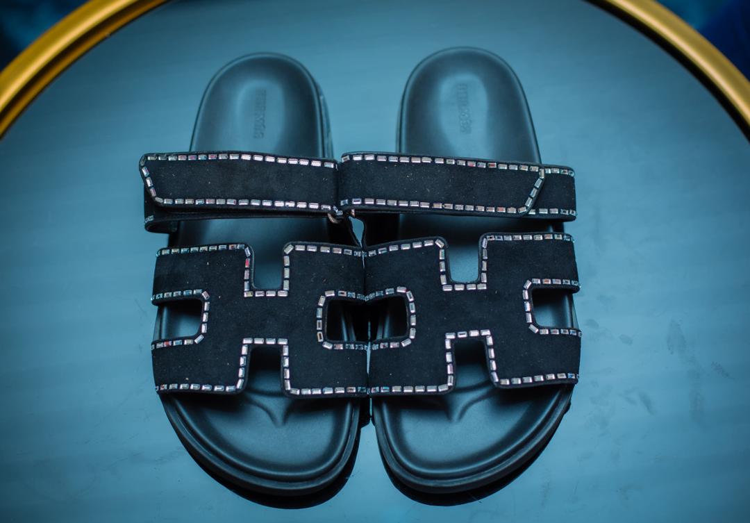 Well known Hermes flats in pure black color, high quality with small rectangle diamonds on the borders.