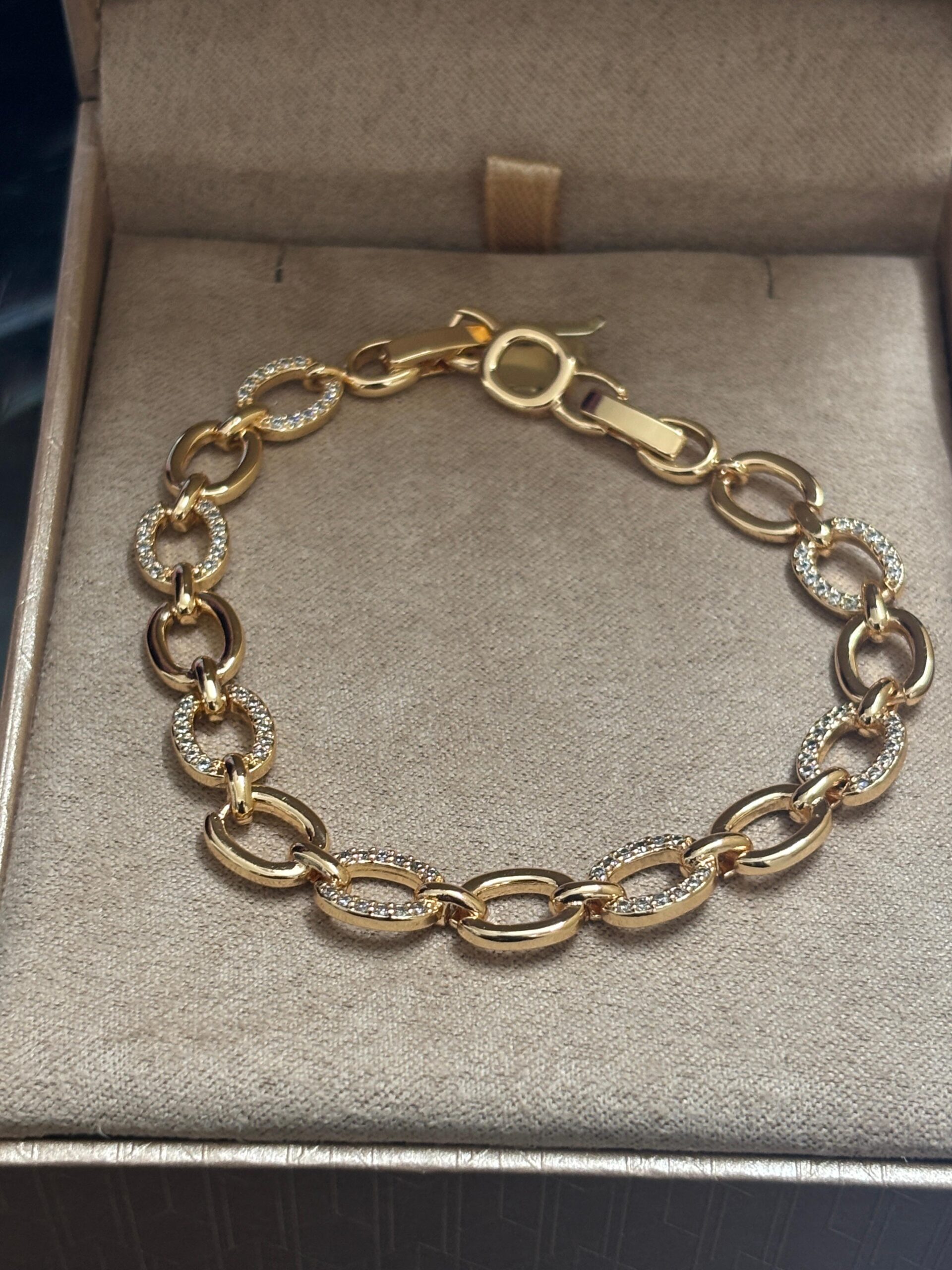 - Elegant Fashionable Inter Linked Chain Gold Toned bracelet for women with diamond studded.