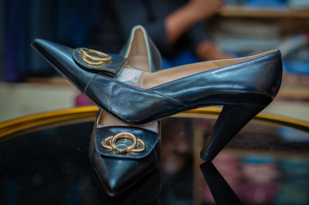 Purse brand leather shoes in black shade with a golden broach on top, high quality product.
