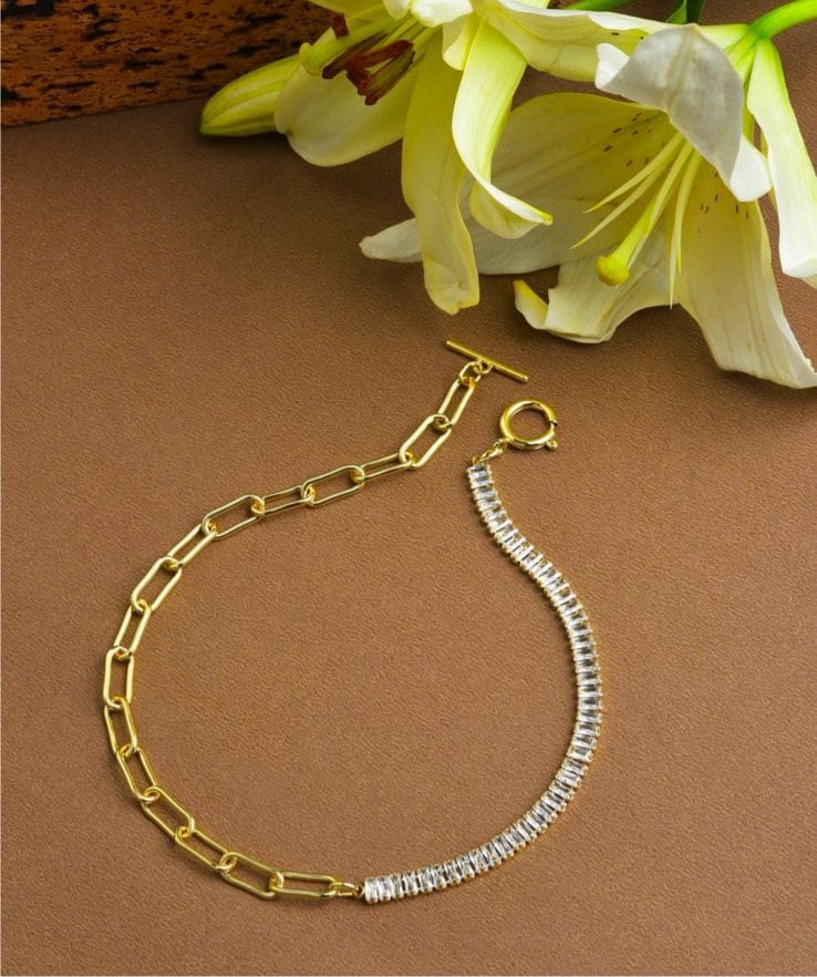 Gold plated brass necklace with crystal diamonds in half & half pattern with high quality polish & skin friendly.