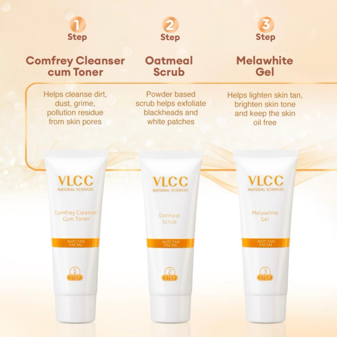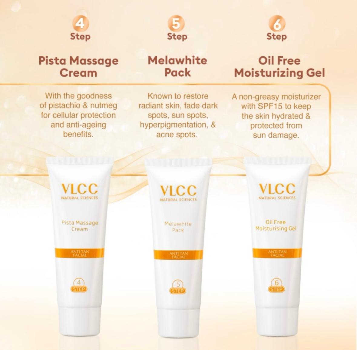 This Anti Tan Facial Kit contains the following components: Cleanser cum toner, Oatmeal Scrub, Mela white Gel, Pista Massage Cream, Mela white Pack & Moisturizing Gel.